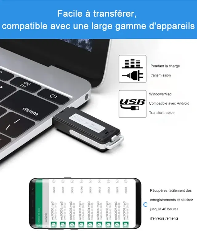 Cette clé enregistre aussi lorsqu'elle est branchée sur un PC, MAC ou une prise de courant vous permettant d'avoir une autonomie illimitée pour plus de 40h d'enregistrement, Vous pouvez aussi enregistrer une conversation en connectant la clé sur un Smartphone Android.